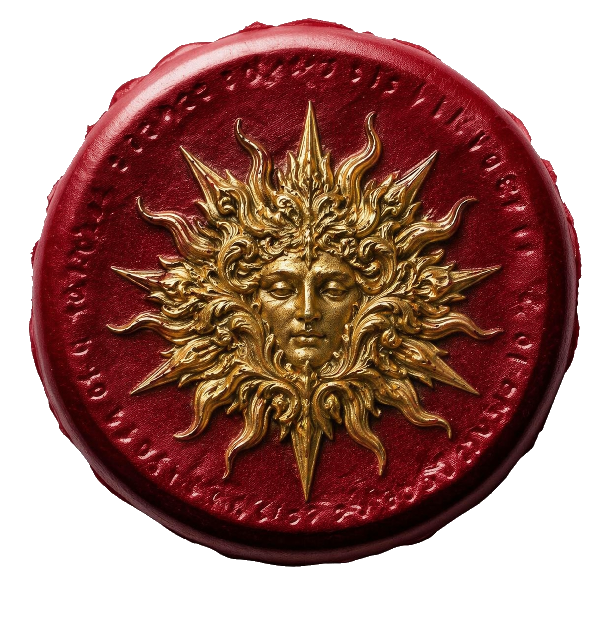 The Solarium seal presents a sol invictus — an unconquered sun — rendered in exquisite high-relief gold upon a ground of deep carmine wax. At its centre, a human face of classical Imperium proportion gazes outward with hooded, serene authority: neither wrathful nor merciful, but absolute. The face is that of a divinity, or a sovereign who has ceased to distinguish between the two.